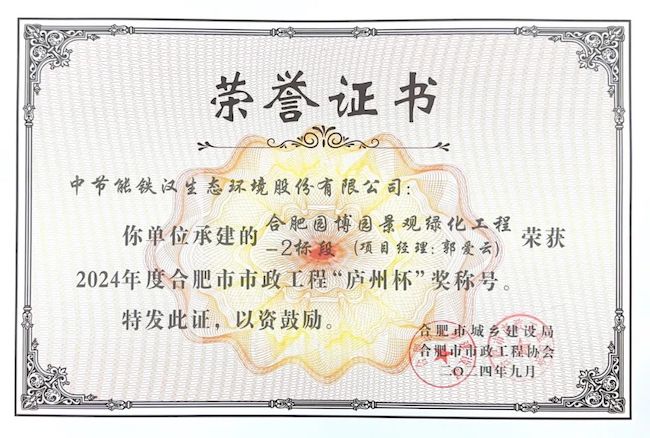 近日,中節(jié)能鐵漢承建的合肥園博園景觀綠化工程-2標段榮獲2024年度合肥市市政工程“廬州杯”獎。